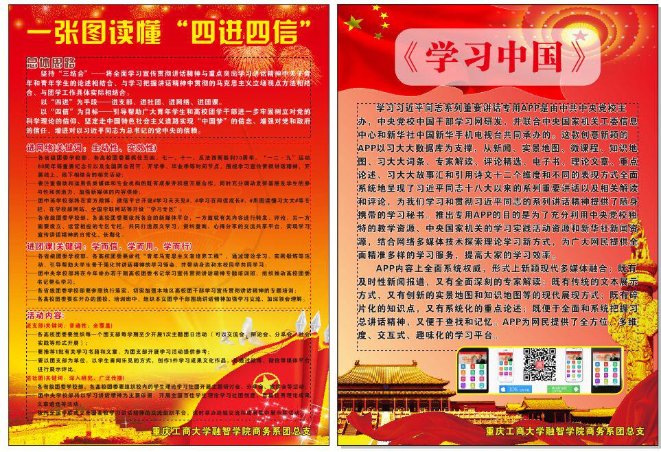 发展班团共建,将班级融入进团总支学生会,更好地发挥班级凝聚力作用;实现消息资源共享,使班团内外联动更加密切;充分调动班级积极性,让被动参与变为主动争取。商务系综合利用学团办公室外墙设立践行社会主义核心价值观展览板,将各班承办活动内容进行展示,与全院师生共同分享学习心得。