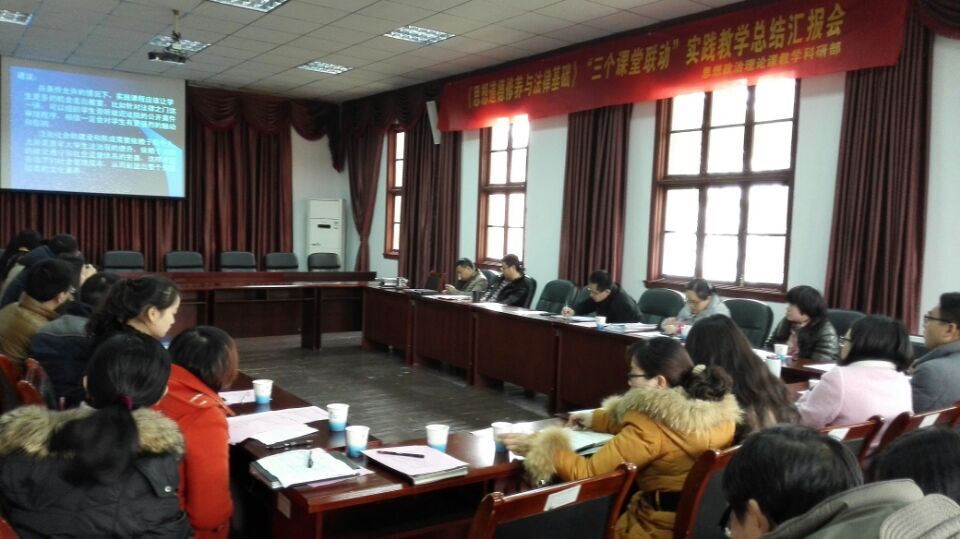 2015年1月下旬,思政部在行政楼301会议室召开了《思想道德修养与法律基础》“三个课堂联动”实践教学总结汇报会。出席本次会议的有院长柏群、副院长吴华安、党委副书记陈龙国、院长助理李果、教务处副处长周雄和滕学英等,思政部全体专职教师和负责本课程实践课的十五位兼职教师参加,思政部副主任常晓薇主持。