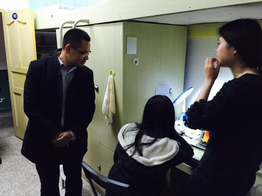 (学生处 李妍彦)2015年3月8日晚,我院党委副书记陈龙国、院长助理兼学生处处长李果带领学生处和各系部分老师、辅导员对学生宿舍进行了走访,了解同学们新学期学习生活情况。