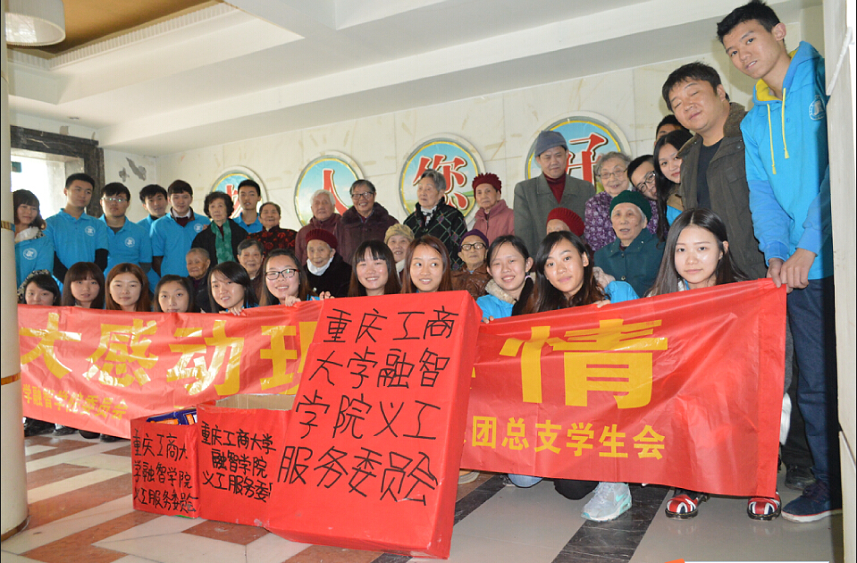 重庆市第一社会福利院是重庆市民政局直属的社会福利机构,是全市最大的养老工程,1942年在宋氏三姐妹倡导下建立,至今已有60余年历史。为在全社会形成关爱老人、孝敬老人的良好风气,11月27日,重庆工商大学融智学院与重庆嘉陵小学的志愿者们带着用义卖报纸、热心同学捐助筹得的善款购买的过冬衣物、生活用品、米、面、粮、油等携手走进重庆市第一社会福利院,在感恩节当天,代表老人的子女为老人们送上诚挚的问候并致以深深地谢意,为他们带去心灵的慰藉,让老人们感受青少年的朝气和社会的温暖。