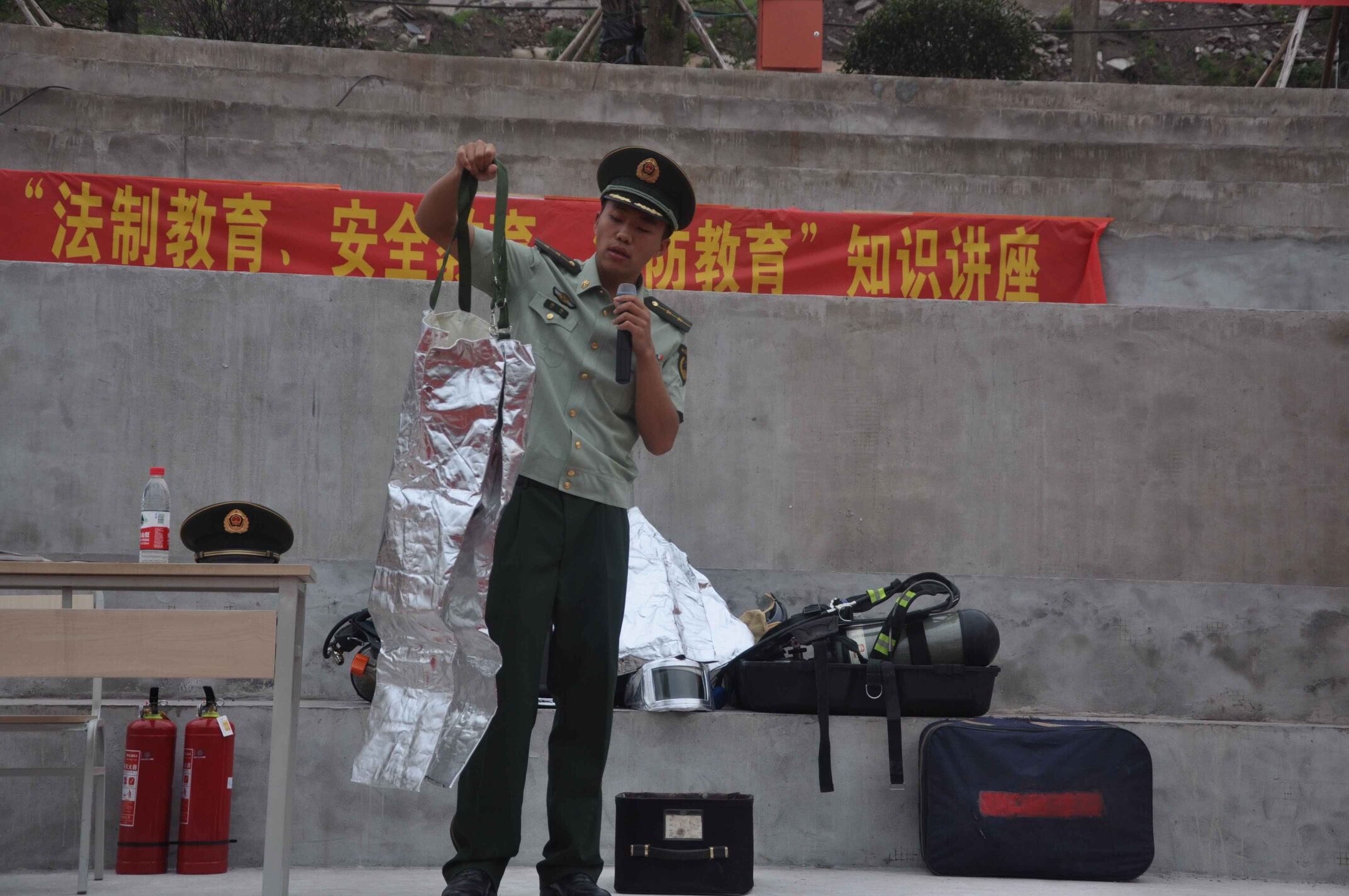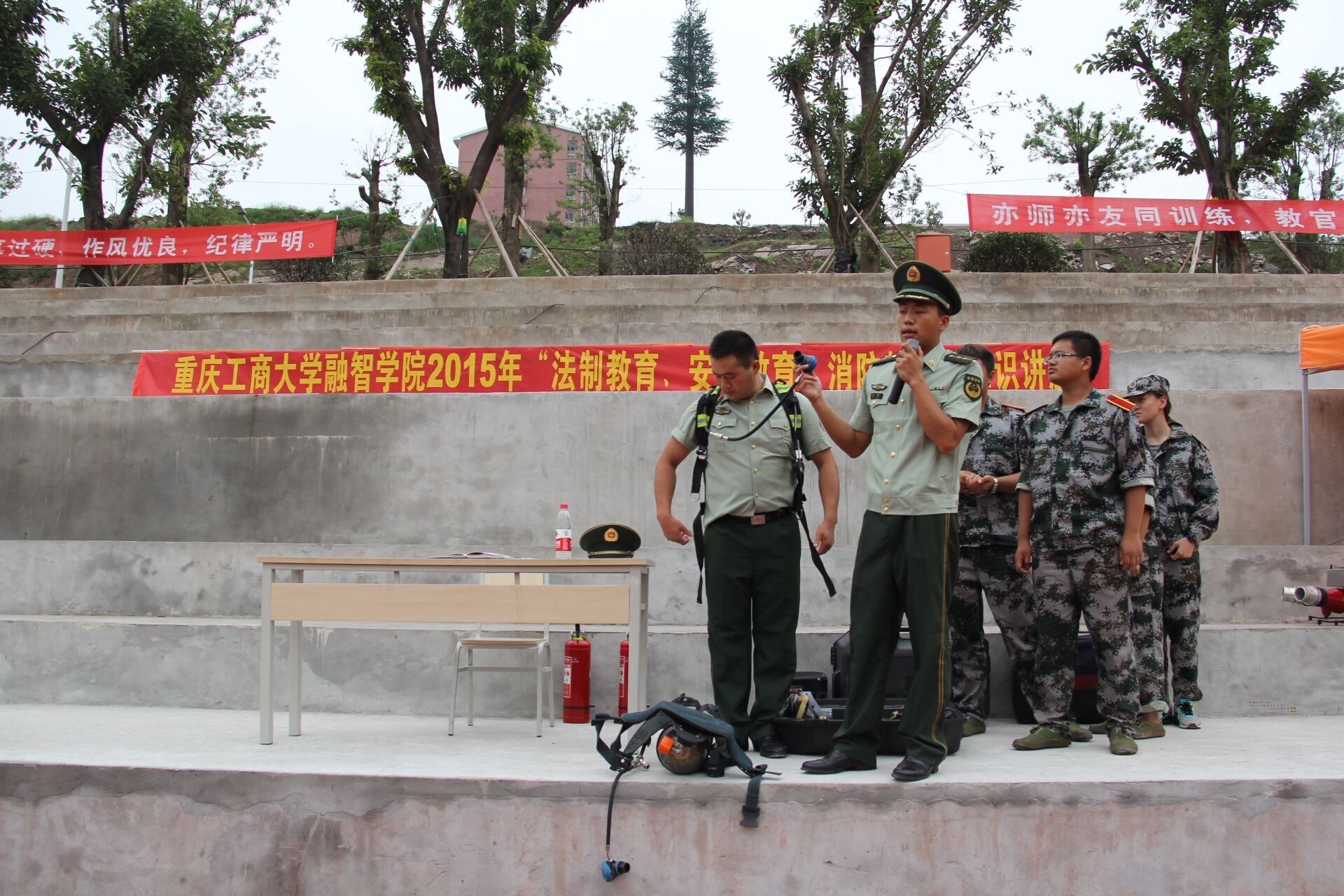 首先由巴南区龙洲湾派出所颜所长进行法制教育讲解,演讲围绕普及诈骗种类,身边发生的诈骗,如何预防诈骗三个部分展开,语言浅显生动,全校师生受益匪浅。其中,颜所长详细介绍了新型诈骗方式以及作为刚刚踏入大学生活的同学们如何进行防范,他表示同学们需要熟练掌握防范知识,提高防范意识,不给骗子可乘之机。随后,巴南区消防支队马教官邀请5位同学上主席台,拿出消防箱为新生们展示消防用具并用实验配合讲解的方式对消防安全知识进行讲解,整个过程幽默有趣,引发同学们的踊跃参与。最后我院保卫处副处长欧英前对之前的安全讲解进行了补充和总结,由于我校尚在建设之中,来往人员复杂,同学们平日里需注意财物保管,晚上需结伴出行以免发生意外。